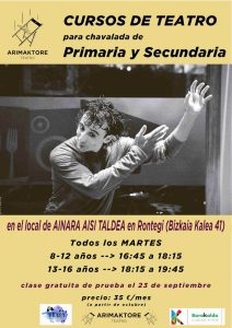 El día 23 de Septiebre, martes tenemos una clase de prueba para niños y niñas de 8 a 16 años que puedan sntir alguna curiosidad para apuntarse a los cursos de teatro de Arimaktore